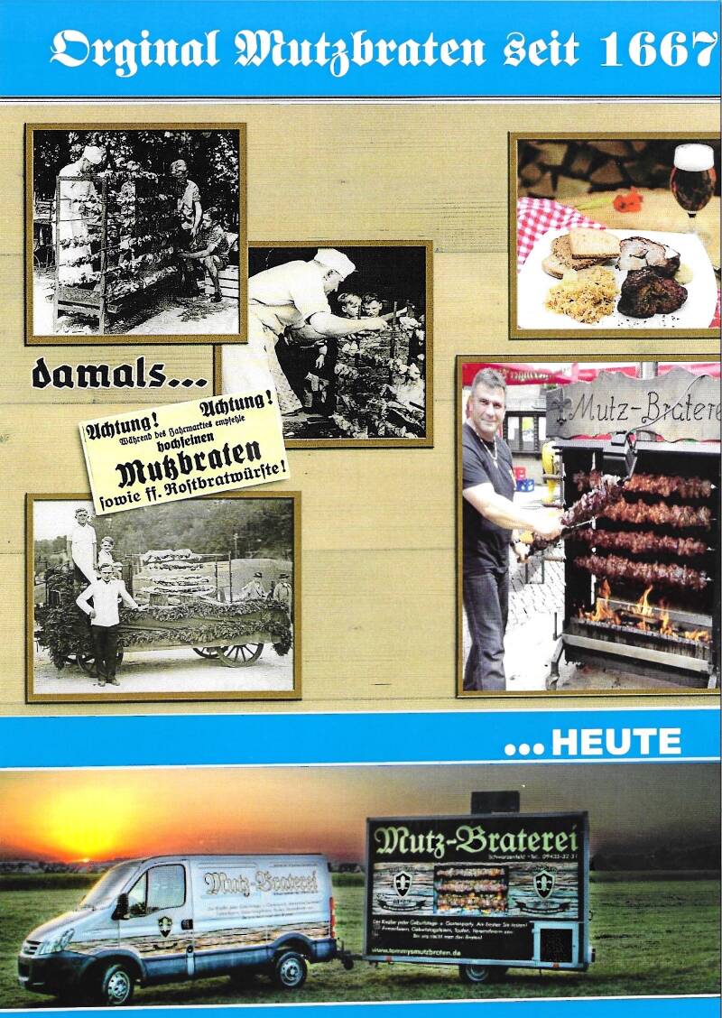 Zu Beginn des 20. Jahrhunderts wurden in Schmölln die ersten Mutzbraten öffentlich angeboten. Der Mutzbratenstand bestand damals aus vier in die Erde gesteckte Stäben, mit seitlichen Auflagen für die Spieße. In der Mitte befand sich ein Lagerfeuer aus Birkenholz, lange Pfannen, die das Fett auffangen, wurden unter die Spieße gestellt. Gedreht wurde anfangs per Hand.